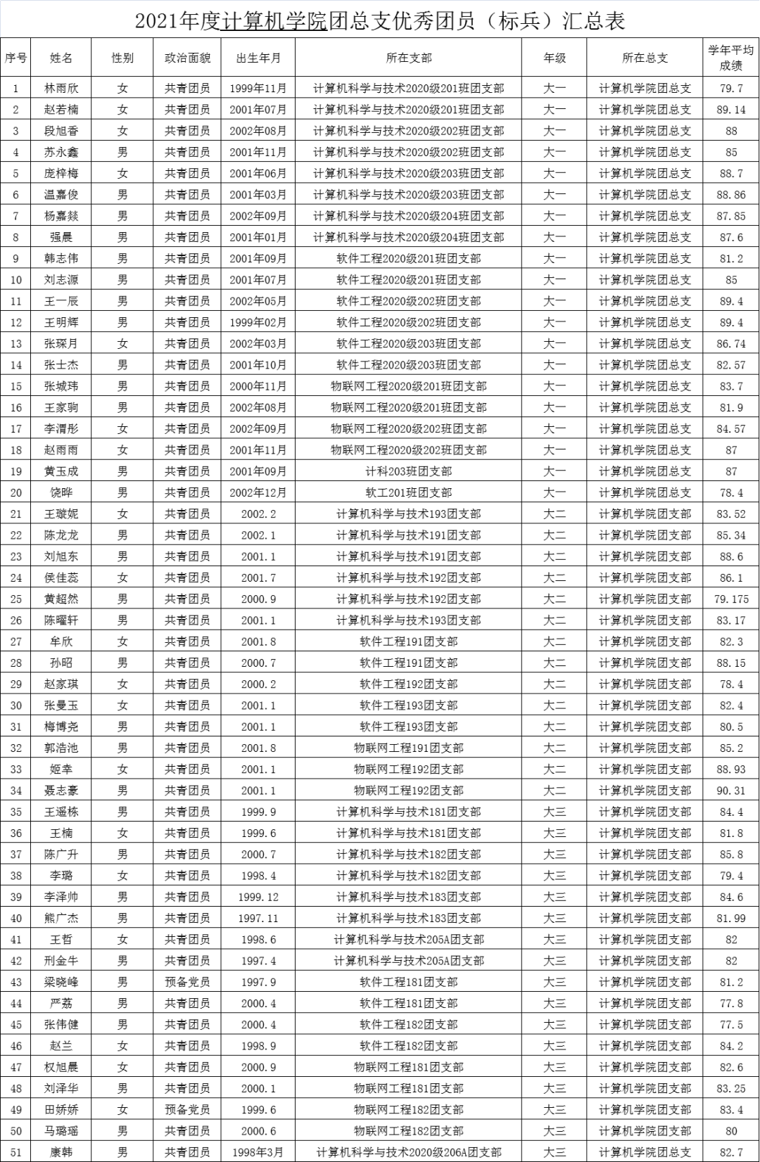 按照校团委《关于开展2021年度西安航空学院共青团先进集体和优秀个人的评比表彰》文件要求,计算机学院团总支已全部完成评比工作。各班级团支部依据支部投票结果评预推荐对象,学院团总支结合团支部青年大学习、主题团日活动、团员团干日常考核、团支部建设等情况,全面并根据上一学年考试成绩进行最终评定,确定最终推荐对象。现将拟订优秀团员(标兵)、优秀团干(标兵)、优秀团支部和星级志愿者名单进行公示。