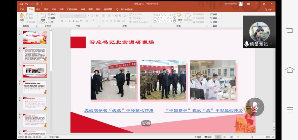 6月5日晚,新黄金城667733学生党支部组织150名学生党员和积极分子开展“在战疫中坚定党的领导,彰显中国精神”的主题讨论课活动,本次活动以线上讨论课的形式进行,让学生党员深入学习中国精神,深刻体会党的领导的重要性。